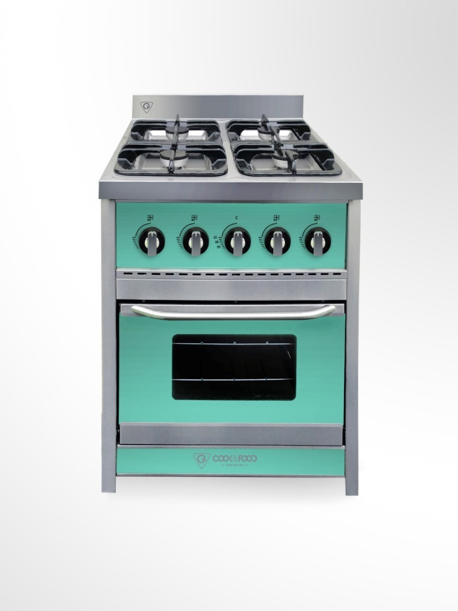 horno encendido en una mano válvula de seguridad y 4 hornallas – Exterior en acero inox. – Rejillas y quemadores de fundición con tratamiento termo resistente – Piso de horno con tejuelas refractarias